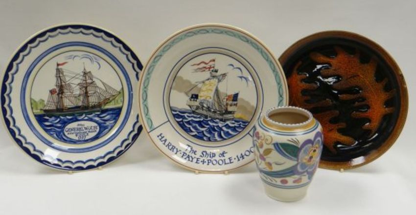 THREE POOLE PLATES & A POOLE VASE comprising 'The Ship of Harry Paye, Poole 1400', 28cms diam, 'Brig General Wolfe, Newfoundland Trader, Poole 1797' an 'Aegean' leaf decorated plate and a vase of typical polychrome decoration, 15cms high