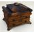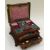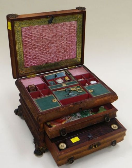 A GEORGE III TRAVELLING-SET WITH 'AS WE FOUND IT' CONTENTS the serpentine shaped box with two drawers and a hinged lid, it is rectangular based and leather covered (distressed) with a fanned sarcophagus top, the finial with brass plaque inscribed M Latimer 1819 and the box is raised on four gilt metal floral feet. The hinged lid reveals the compartmented and cushioned sewing section and contains various associated trinkets including gilded scissors, ivory-based pin-cushion, mother-of-pearl items etc. The upper drawer contains a sequin bag and five Raphael Tuck & Sons figure-cards while the lower drawer is a writing slope with inkwells, 33cms wide