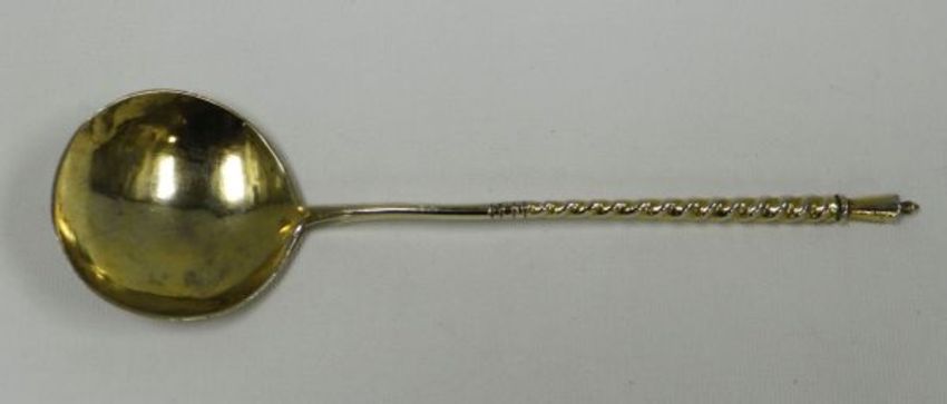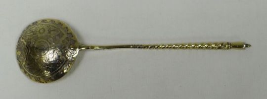 A RUSSIAN SILVER GILT SPOON with floral engraved bowl and monogram and having a spiral stem, marked 84, 18cms long, 17gms