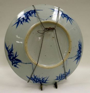 A CHINESE BLUE AND WHITE PLATE profusely decorated with a pair of opposing dragons, lotus flowers and with a prunus border, the base decorated with reeds, no marks, 30cms diam