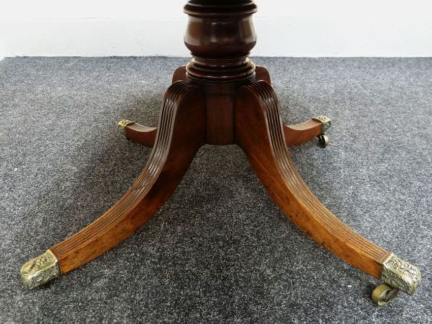 A FINE QUALITY TILTING MAHOGANY TEA TABLE of rounded rectangular form and on turned columnal base with four reeded and curved supports and having decorative brass socks and casters, the tilting with pinch-mechanism, 151 x 115cms