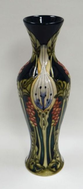 A LIMITED EDITION (45/50) MOORCROFT VASE DESIGNED BY KERRY GOODWIN with tublined stylised berries and plants to a green ground, dated 2002, 31cms high