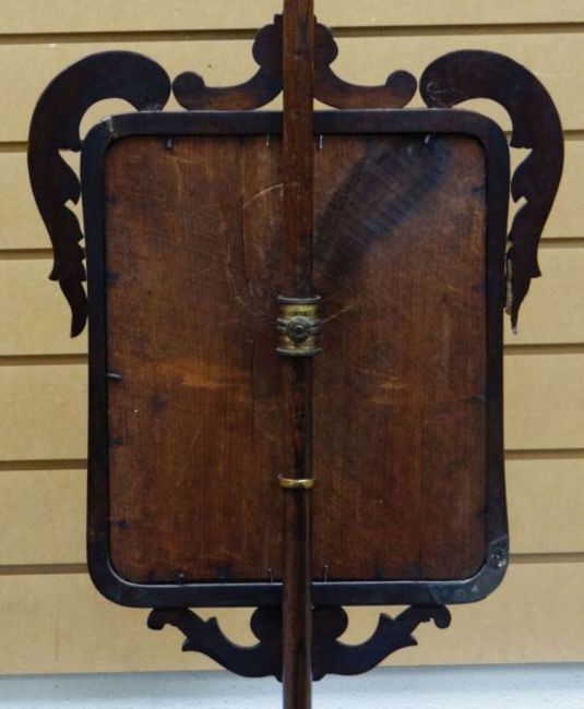 A POLE SCREEN WITH PARROTS EMBROIDERY in a rectangular frame with scroll mounts and on a bulbous fluted support with circular base and three claw feet