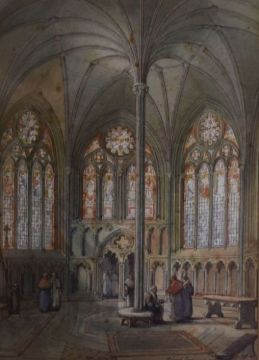 ALFRED EDWARD PARKMAN watercolour - architectural study of the interior of Salisbury Cathedral with figures, entitled 'Salisbury' and dated 1917, 30 x 22cms
