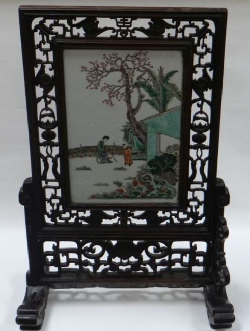 A FAMILLE VERT TABLE SCREEN in a fretwork hardwood stand, the porcelain panel depicting two figures in a garden, 61cms high