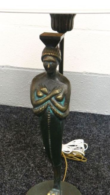 A PAIR OF MODERN FIGURAL STANDARD LAMPS green painted on circular bases and with a matching table lamp