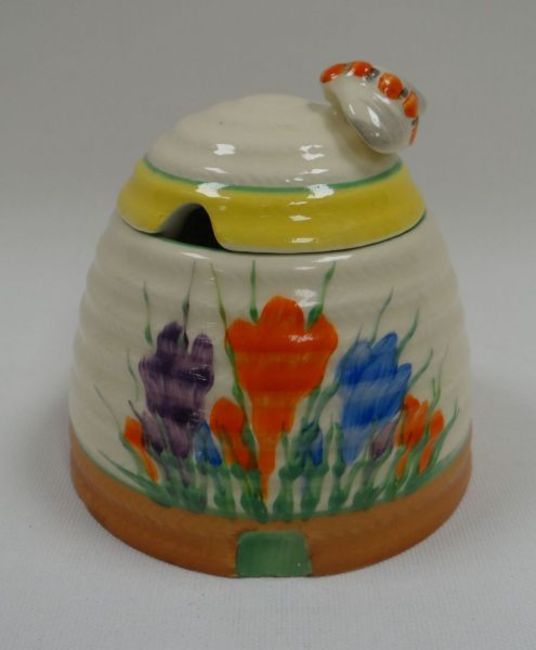 CLARICE CLIFF 'CROCUS' BEEHIVE HONEY-POT, 10cms high