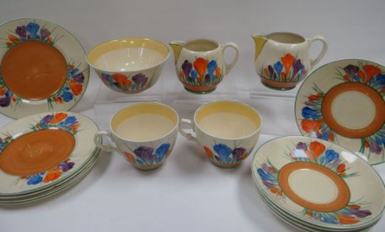 A CLARICE CLIFF 'CROCUS' PART-TEA SET comprising a pair of milk-jugs, sugar basin, two tea-cups, five saucers and five tea-plates