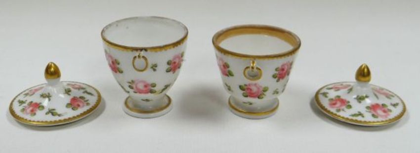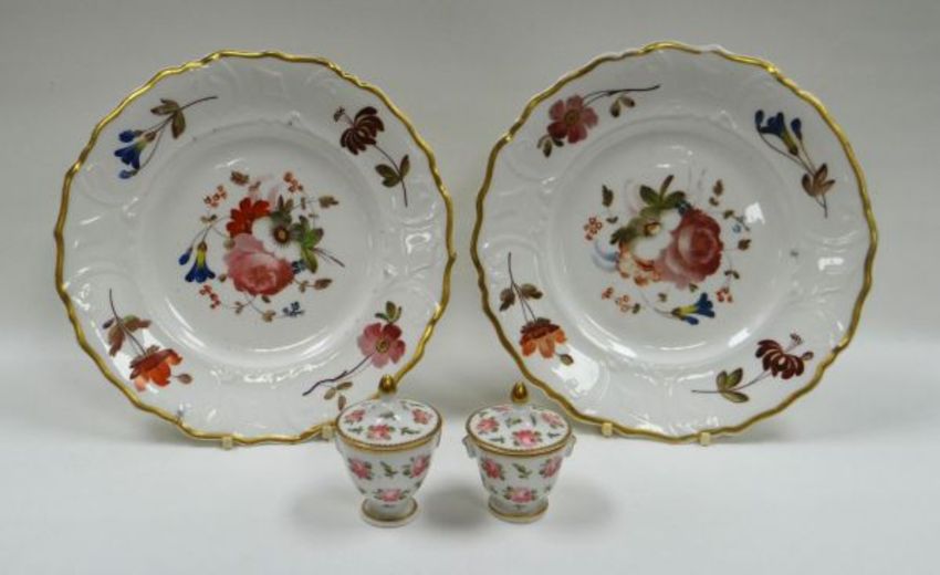 A PAIR OF PORCELAIN PLATES having moulded borders and with sprays of flowers, each with red stencilled marks for SWANSEA, 22cms diam; together with a pair of covered urn-shaped egg-cups decorated with multiple roses