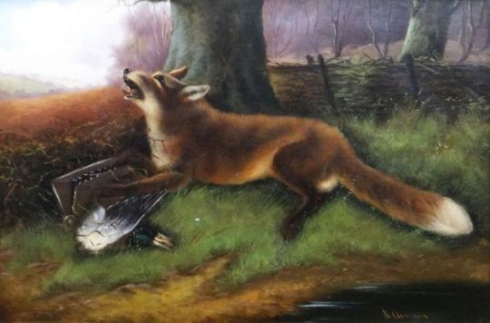 ROBERT CLEMINSON oil on canvas, a pair - sequential fox studies, the first chasing a mallard and the second with trap and mallard, signed, 50 x 75cms