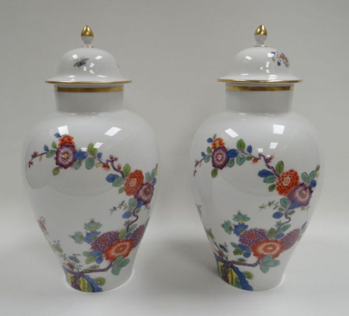 A PAIR OF MODERN MEISSEN PORCELAIN VASES with covers, of baluster form and decorated with Oriental style branches of flowers, 24cms high