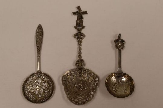 THREE DECORATIVE SPOONS comprising a castor spoon with decorative openwork to the circular bowl, Chester 1891 by Saunders & Shepherd, a Dutch silver castor spoon with windmill finial, and an import silver preserve spoon, 3.5ozs total