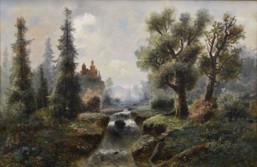 H KOLBE oil on canvas, a pair - Alpine river landscapes with figure and chateaux, signed, 51 x 78cms