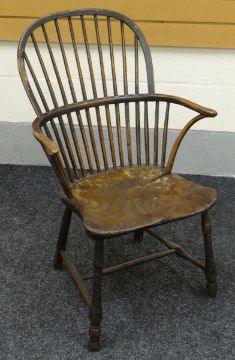 A SMALL WINDSOR ELBOW-CHAIR in elm and having a shaped seat and two stage stick back circa 1820