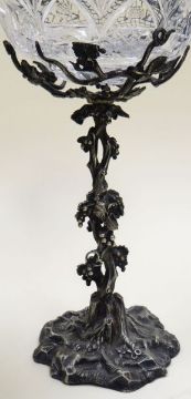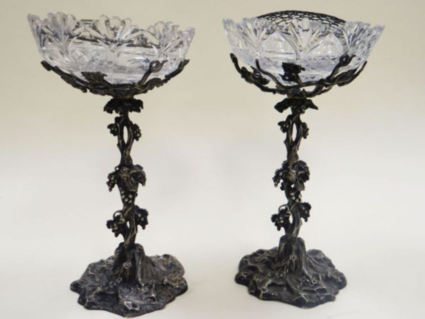 AN EPNS NATURALISTIC TABLE-CENTRE PIECE with six outward leaf-form dishes and a centre trumpet-top of conjoining leaves, 49cms high, together with two smaller vine-form comports with glass bowls, 33cms high