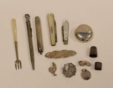 A PARCEL OF SILVER / PART-SILVER COLLECTABLES including two mother-of-pearl silver fruit-knives, two silver pencils, pill-box, brooch, charms etc