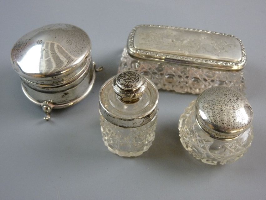 A CIRCULAR SILVER VELVET LINED RING BOX on three pad supports, Birmingham 1913 (some impact damage) and three glass hobnail cut dressing table containers, all with silver tops