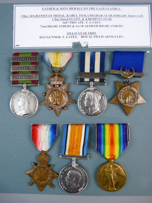 MEDALS - FATHER AND SON MEDAL GROUPS to the Gates Family, 72nd Highlanders and 1st Seaforth Highlanders, 1607 Pte. T. Gates, swivel mounted Afghanistan with three clasps for Charasia, Kabul and Kandahar, an officially impressed Kabul to Kandahar Star, an Egypt 1882 on swivel mount with Tel-El Kebir clasp, all fully marked with the Khedives Star, the 1914-15 Star trio marked 8123 Gnr. T. Gates.R.F.A