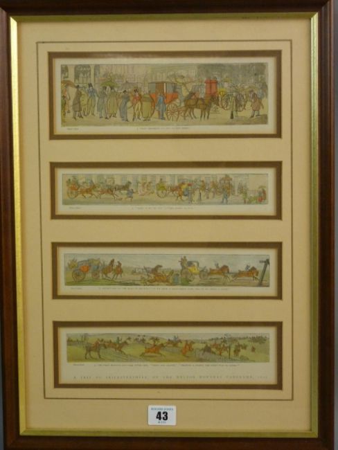 After HENRY ALKEN four coloured hunting prints in one frame and entitled 'A Trip to Leicestershire', or 'The Melton Mowbray Panorama, 1820', the prints measuring 5 x 24 cms (three) and 8 x 24 cms (one), overall size within frame 45 x 32 cms