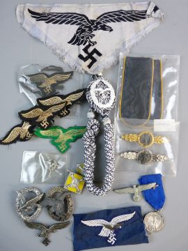 LUFTWAFFE MEMORABILIA to include a quantity of uniform chest eagles, a sport's shirt chest eagle, a pair of shoulder boards, a sharp shooter's land yard, a silver long distance night fighter's badge, a gold night fighter's badge, a women's auxiliary pin, a four year long service medal and six other badges and pins including an observer's badge and radio operator's badge