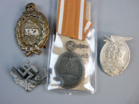 GERMAN THIRD REICH BADGES & WEST WALL MEDAL to include a 1936 Second SA Nordmark Treffen meeting badge, stamped to the back Paulmann & Chrone, Ludenscheid, a West Wall medal with envelope of issue, a Nazi women's RAD leader badge and a WWI style Panza assault badge stamped to the reverse 'Zeitner, Berlin' (possible copy)