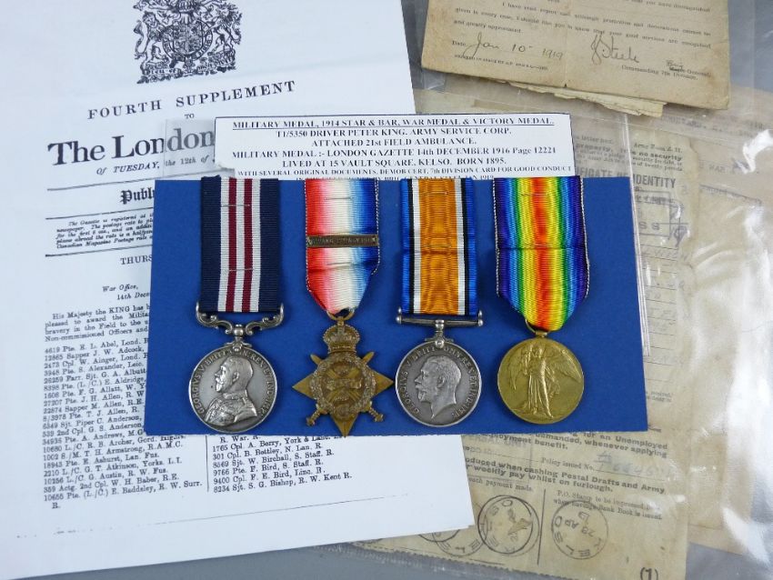 MEDALS - A GREAT WAR MM GROUP OF FOUR awarded to TI-5350 Dvr. P. King.A.S.C., GV Military medal for 'Bravery in the Field', 1914 Star and War medal and 1914-19 Victory medal along with several original documents and copy supplement to the London Gazette