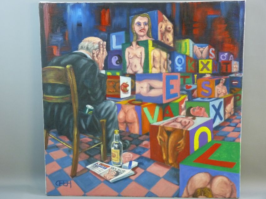 CARL F HODGSON oil on box canvas - signed with initials and entitled 'Still Not Learned', 65 x 65 cms