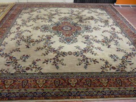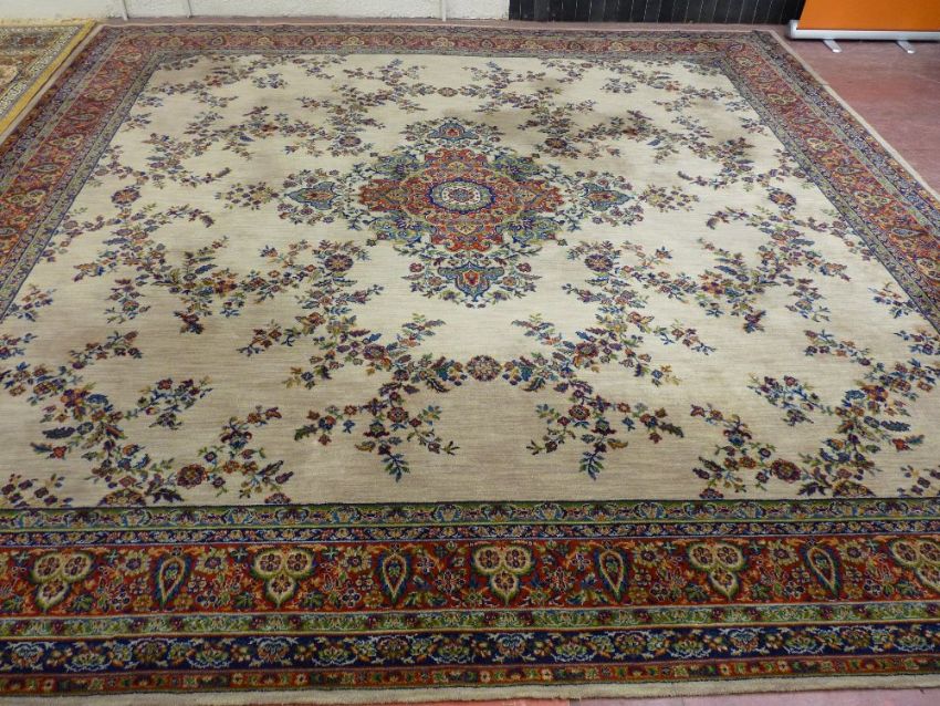 A FLORAL WOOL MIXTURE CARPET having a six row outer floral band with a fawn centre with large central floral display and surrounding floral sprays, approximately 3.6 metres square