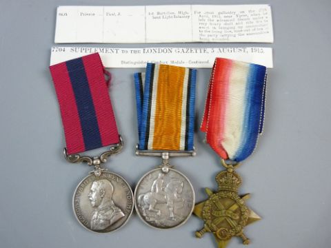 MEDALS - WWI FIRST BATTALION HIGHLAND LIGHT INFANTRY DCM group of three, awarded to 8495 Pte. J. Paul, 1914-15 Star, a GV 1914-18 War medal with the Distinguished Conduct medal, supplement to the London Gazette reads 'For Great Gallantry on the 27th April, 1915 near Ypres, when he left the advanced trench under very heavy shell and rifle fire to assist in bringing up ammunition to the firing line, nine out of ten of the party carrying the ammunition being wounded', medals loose, all fully marked