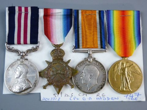 MEDALS - A WWI MILITARY MEDAL GROUP OF FOUR, MM to 4063312 Cpl. G.A. Hadden 51/D.S.COY.R.E., 1914-15 Star to 747 Dvr. G. A. Hadden.R.E., War and Victory medals marked 747 Cpl. G. A. Hadden.R.E. (no paperwork)