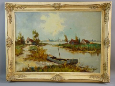 E MARRIS oil on canvas - Continental river scene with beached boat, cottages and distant village and church, signed, 48 x 68 cms