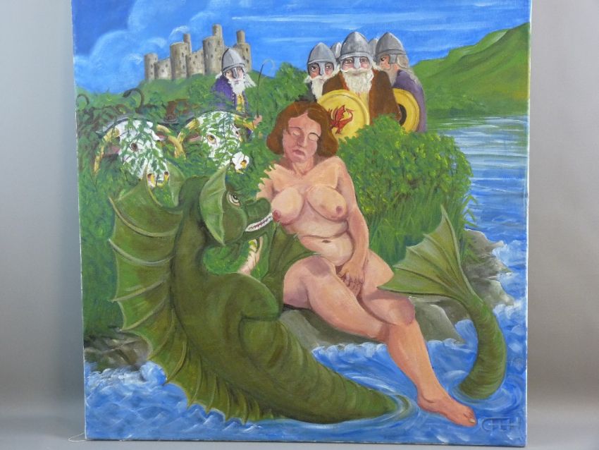 CARL F HODGSON oil on box canvas - signed with initials and entitled 'Enticing the Afanc of Conwy Onto the Ban', 77 x 77 cms