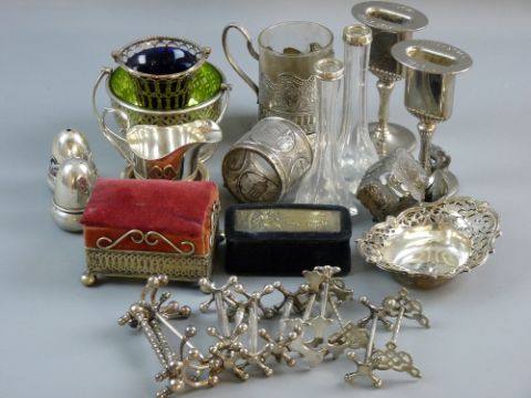 A BOX OF MIXED SMALL ELECTROPLATED ITEMS and a pair of narrow necked glass posy vases with silver collars