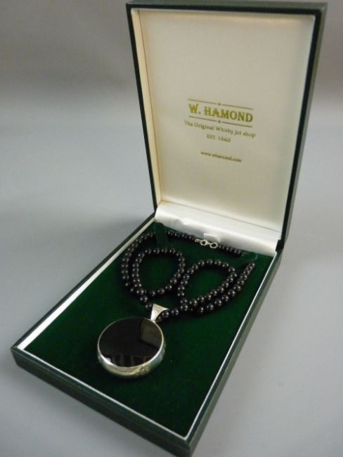 A WHITBY JET BEADED NECKLACE with a circular 925 silver framed pendant fob having on one side a Blue John stone and on the other Whitby Jet, 3.5 cms diameter, pendant gross weight, 23 grms, total weight 38 grms, complete in W Hamond box and with copy guarantee