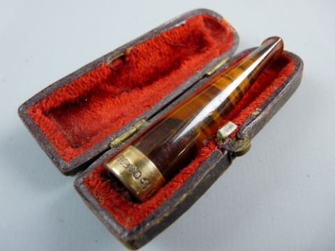 A CASED AMBER CIGARETTE HOLDER with nine carat gold band, Chester 1898