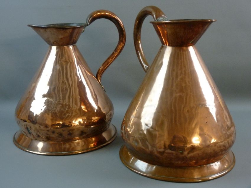 A PAIR OF ANTIQUE TWO GALLON COPPER BEER MEASURES, 34 cms high