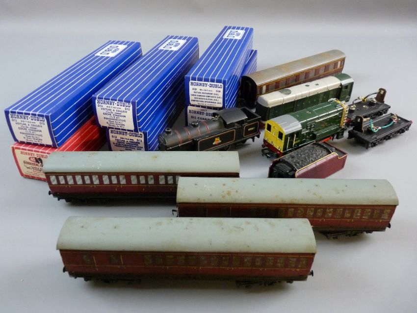 MODEL RAILWAY - Ten Hornby Dublo three rail coaches, five in replica boxes including 4048, 4049 restaurant cars with Hornby Dublo three rail N2 tank locomotive and Dublo three rail spares, 0-6-0 diesel shunter (non-motorized), 8F three rail tender chassis x 2, 8F tender bodyshell, Bo Bo bodyshell