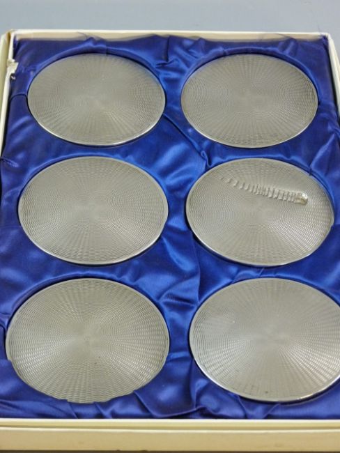A CASED SET OF SIX SILVER ENGINE TURNED WINE COASTERS, Birmingham 1974 (severe impact damage to the surface of one)