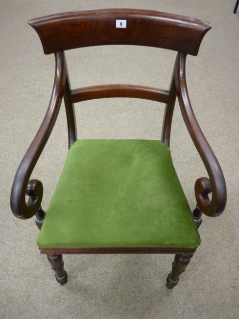 A VICTORIAN MAHOGANY ELBOW CHAIR with gently curved top rail, scrolled arms and turned front supports and with green dralon drop-in seat