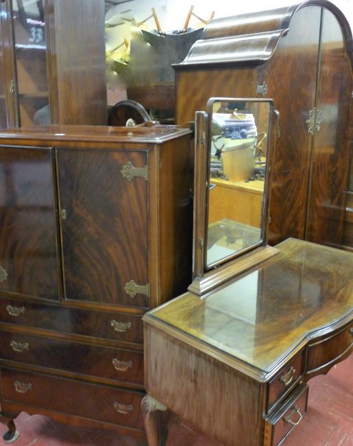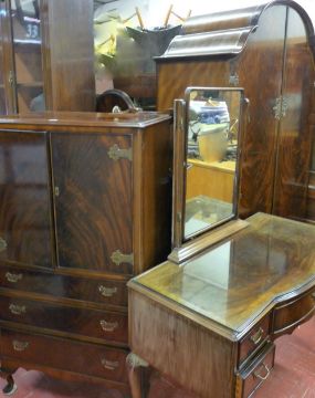 AN EARLY 20th CENTURY DARK MAHOGANY BEDROOM SUITE, the double wardrobe of domed form with tallboy having two cupboards and three drawers, a bow front kneehole dressing table and pair of single bed ends