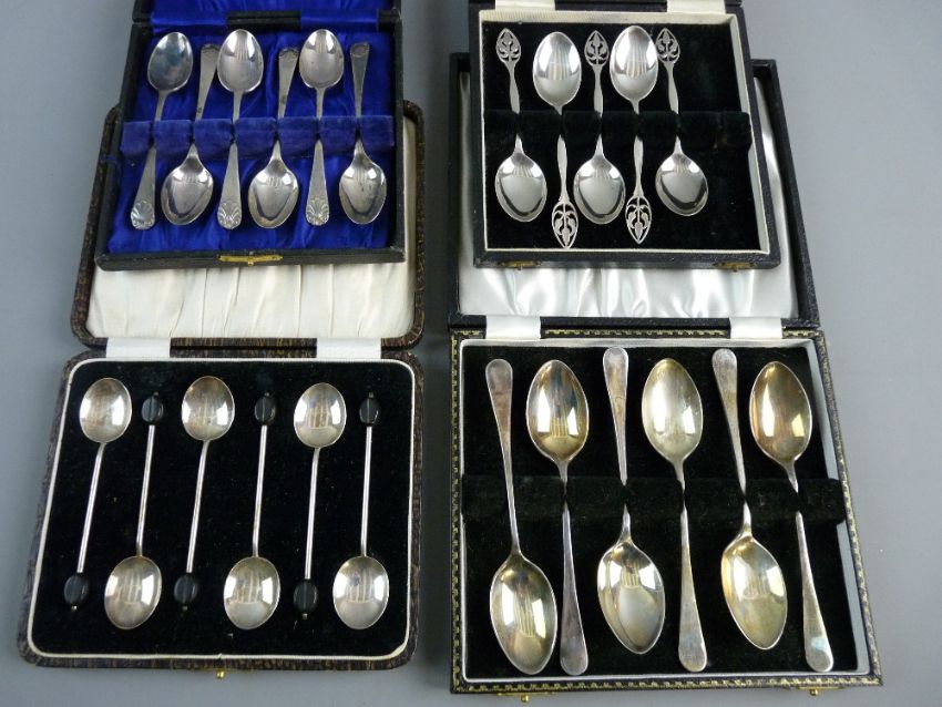 THREE SETS OF CASED SILVER TEA/COFFEE SPOONS and one other, to include a set of six teaspoons, a set of six coffee bean spoons, five from a set with pierced handles and a set of six EPNS, approximately 6 troy ozs overall weighable