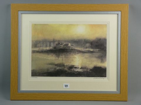 WILLIAM SELWYN coloured limited edition (123/300) print - Gorad Goch Island on the Menai Straits, signed in full, 29 x 39 cms