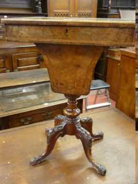 A VICTORIAN WALNUT SEWING TABLE, oblong topped with compartmented interior and recess to four scrolled and carved supports