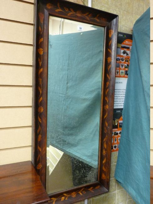 AN ARTS & CRAFTS STYLE FLORAL DECORATED WALL MIRROR, the concave walnut surround leaf and floral inlaid with various coloured woods, 105 cms high, 47 cms wide (plate pitted)