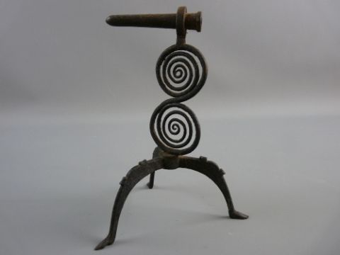 AN ALL METAL TRIPOD GOFFERING IRON having a double swirled column, 18 cms high