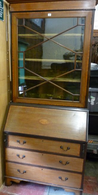 AN EDWARDIAN MAHOGANY AND CROSSBANDED BOOKCASE BUREAU having a scrolled pediment over a single thirteen pane glass door over a shell inlaid slope front and three graduated drawers below