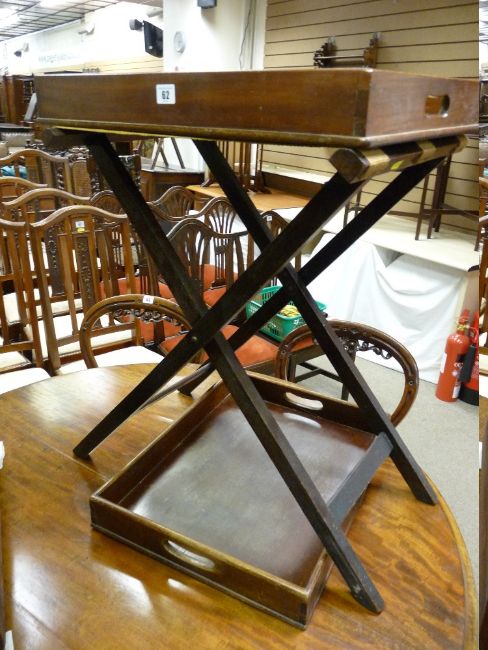A LATE VICTORIAN MAHOGANY BUTLER'S TRAY AND STAND plus additional tray, 76 cms approximate overall height, 40 x 53 cms the largest tray interior measurements