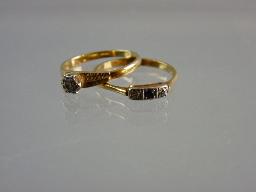 AN EIGHTEEN CARAT GOLD AND PLATINUM DRESS RING with an oblong band of centre sapphire and two tiny flanking diamonds, 2.5 grms and a gold diamond solitaire dress ring, visual estimate of diamond 0.2 carats