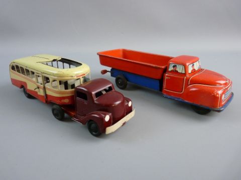 TWO GERMAN TINPLATE CLOCKWORK VEHICLES including a Heinrich Wimmer HWN-1950 bus, bakelite cab front unit with hook-on tinplate coach section in red and cream livery with sliding open roof, marked 'Made in US Zone, Germany', 24 cms approximate length and a Nuremberg NBN friction drive blue and red tipper truck with lithograph cab figures, 22 cms long, marked 'DBGM, Made in Western Germany'