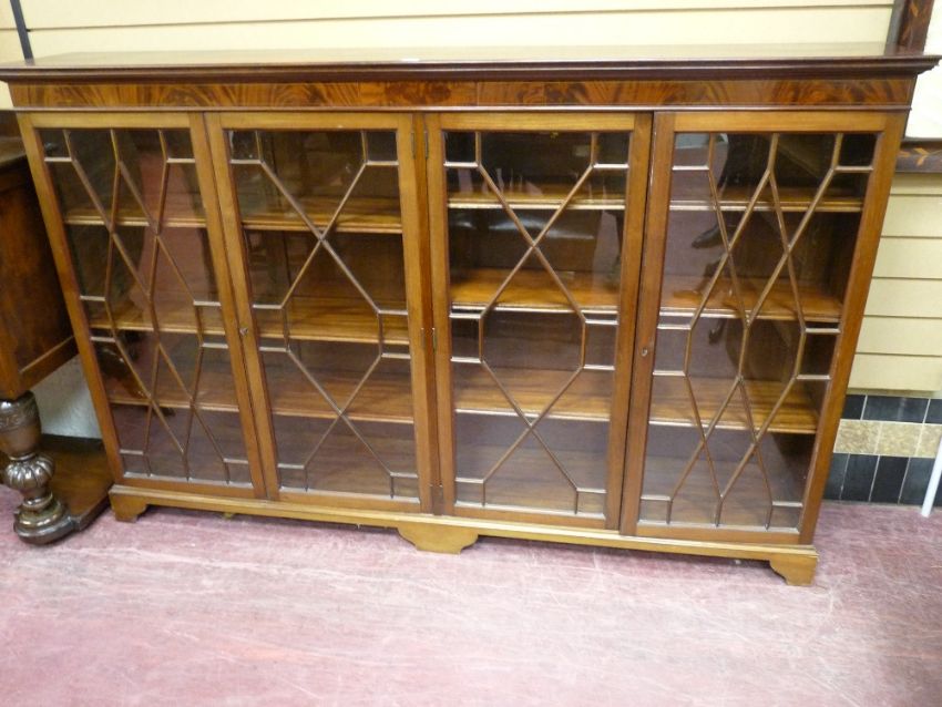 A GOOD EARLY 20th CENTURY MAHOGANY FOUR DOOR BOOKCASE having an inverted moulded top over a boxwood strung frieze, twin pairs of astragal glazed doors, thirteen pane central and eighteen pane flanking with adjustable interior shelves, the whole on bracket shaped supports, 122.5 cms high, 189 cms wide, 32 cms deep